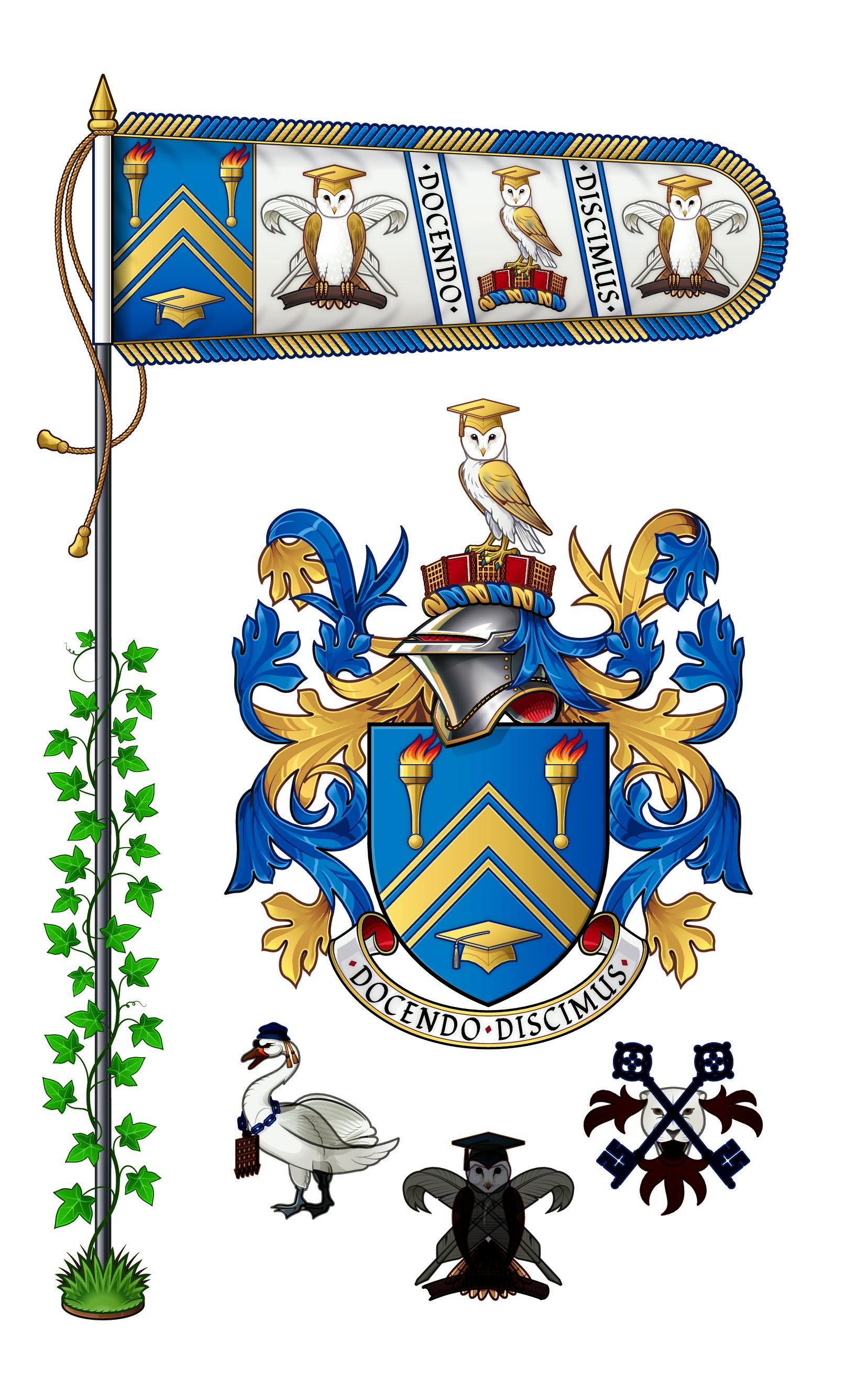 For a badge: Two Talbots countercourant in pale that in chief Or that in base Sable each gorged with a plain Collar attached thereto a Line terminating in a Ring reflexed over the back and environing the other counterchanged.